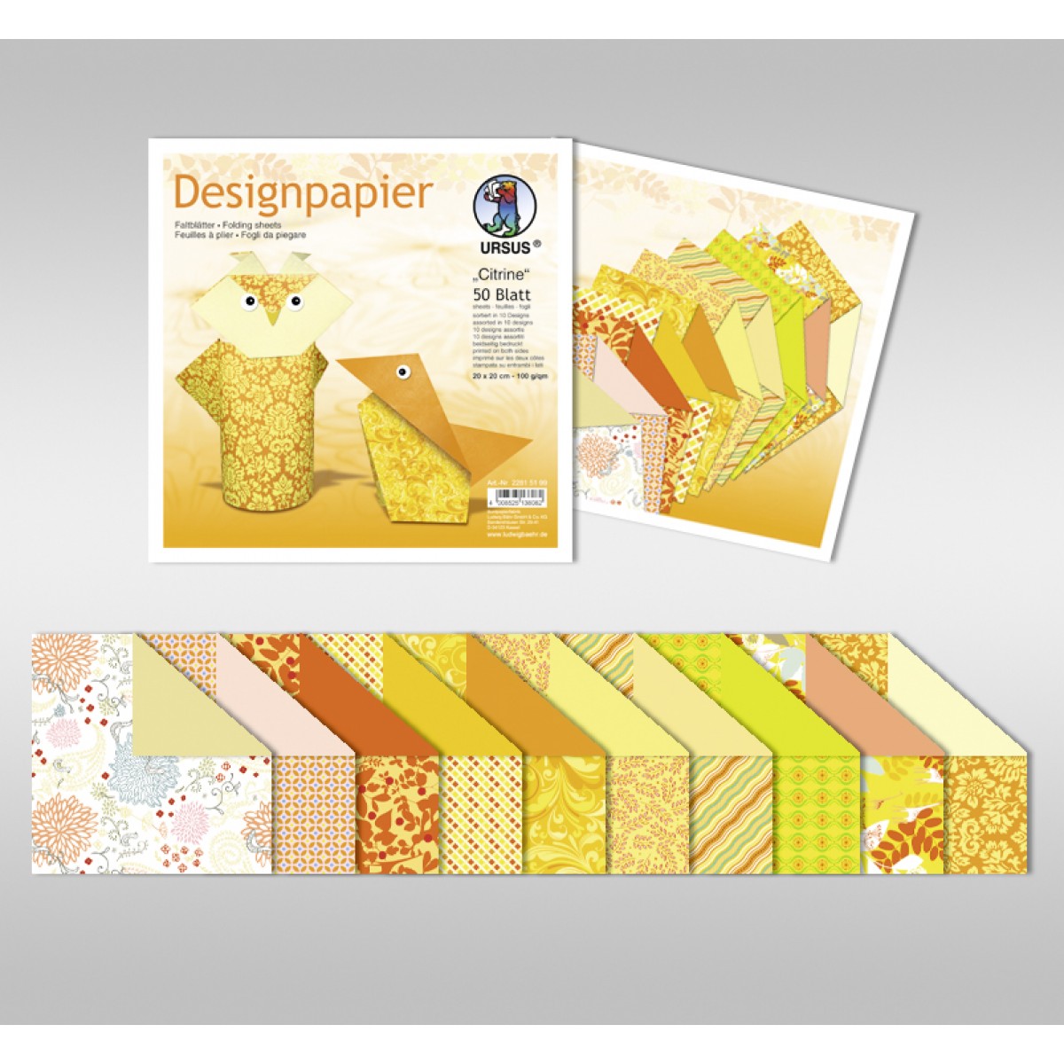 Faltblätter aus Designpapier sind beidseitig bedruckt in einer Papierstärke von 100 g/m². Auf der Vorderseite ist das Papier im gewählten Design und die Rückseite ist in einer Farbe gehalten. Das Päckchen besteht aus 50 Blatt in der Größe 10 x 10 cm in 10 unterschiedlichen Designs.