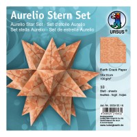 Aurelio-Stern "Earth Crack Paper" mit 33 Faltblättern aus handgeschöpftem Naturpapier mit Metalic-Effekt. Die Faltblätter sind in der Farbe Silber. Das Designpapier des Aurelio-Stern hat eine Papierstärke von 100 g/m² und ein quadratisches Papierformat von 15 x 15 cm.