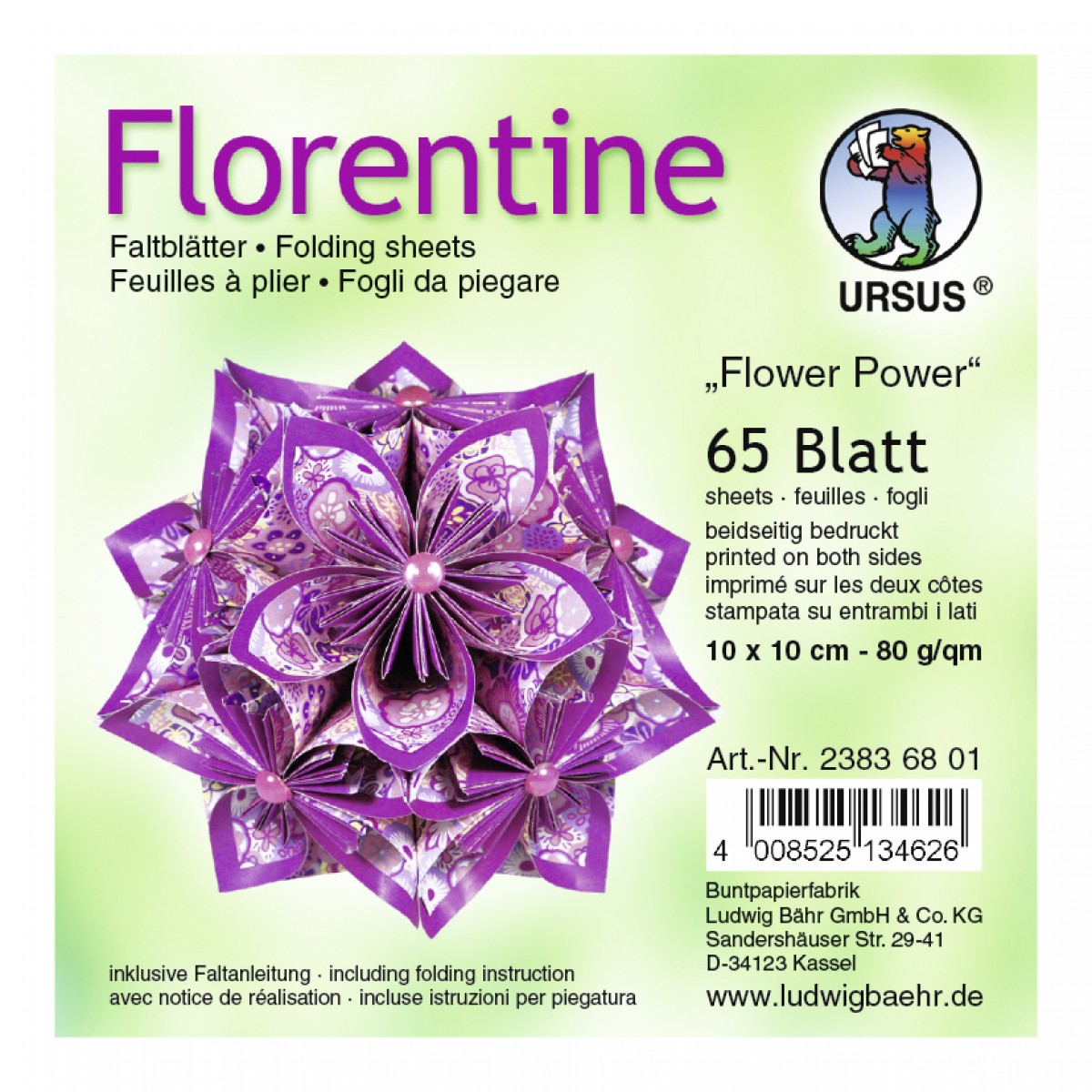 In einer Packung befinden sich 65 Blatt quadratisches Papier mit einer Stärke von 80 g/m² und einer Größe von 15 x 15 cm. Das Papier ist auf der Vorderseite mit dem Blumendesign, auf der Rückseite einfarbig bedruckt. Gemeinsam mit den Faltblättern kommt eine Bastelanleitung nach Hause, die schrittweise durch den Faltvorgang führt.