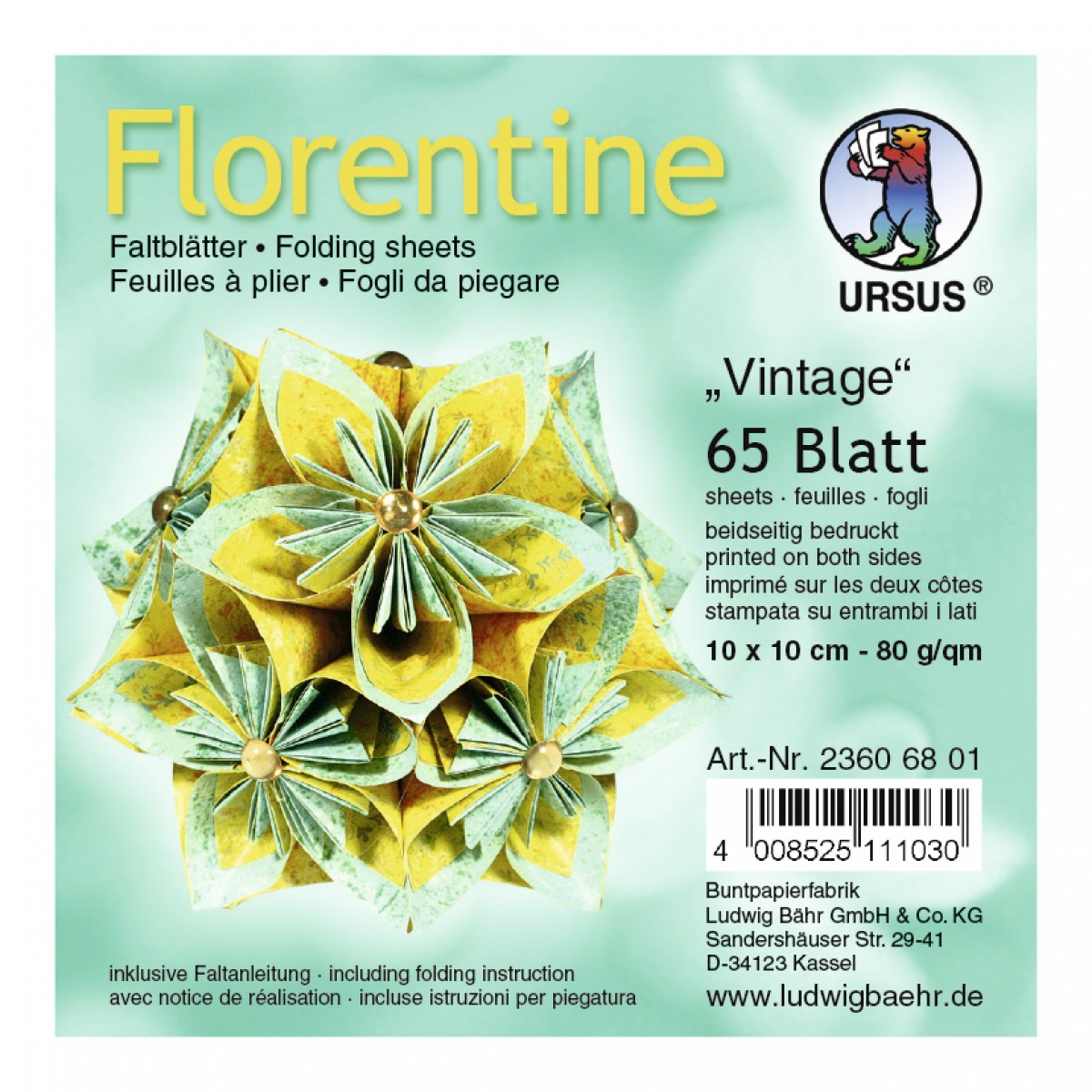 Die Faltblätter "Vintage" in den Vintage-Designs der Serie "Florentine" sind Papiere von 65 Blatt in 5 verschiedenen Motiven. Die Papierstärke beträgt 80 g/m² und die Faltblätter haben eine quadratische Größe von 15 x 15 cm. Die beigefügte Bastelanleitung führt schrittweise durch das Falten mit Buntpapier.