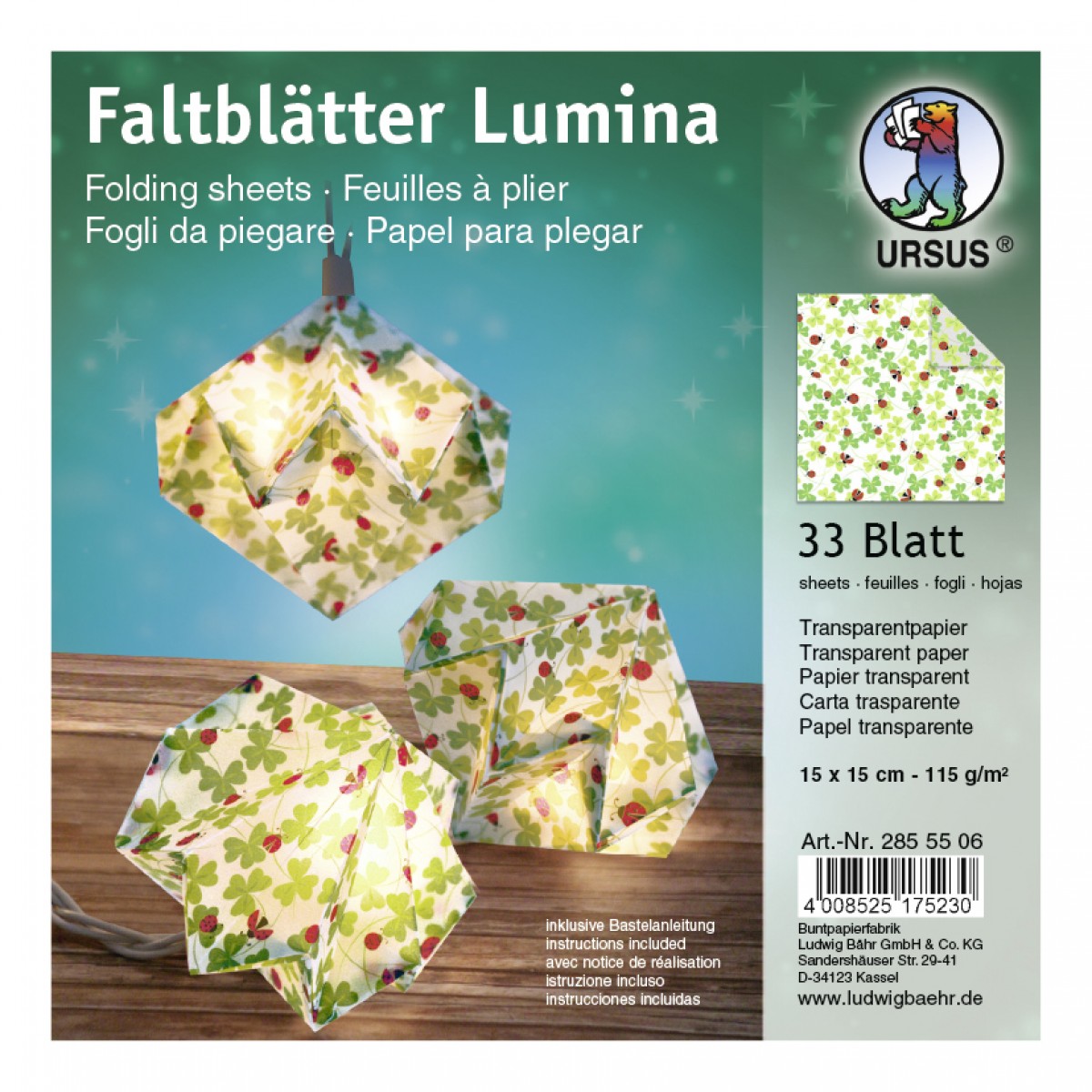 Für Frühlingsbasteln bietet sich die Verwendung von Transparentpapier an. In bedruckten Klee- und Marienkäfer-Motiv kommt dieses Set mit 33 Faltblättern "Lumina" von URSUS® mit einer Papierstärke von 120 g/m² und gibt mit einer Bastelanleitung auch gleich Inspiration für kleine Lampenschirme mit auf den Weg.
