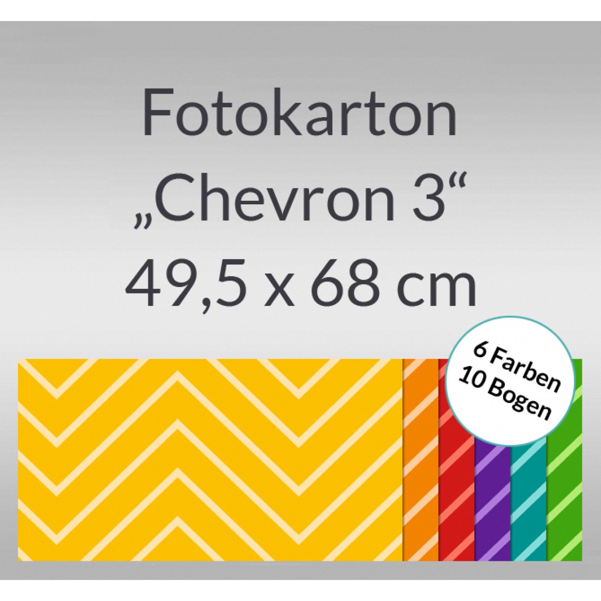 Die Sortierung des Fotokarton "Chevron 3" im Design mit Zackenlinien ist zu 10 Bogen aus den 6 Farben "Chevron 3" ausgewählt. Die Stärke des Fotokarton beträgt 300 g/m² und ist auf die Größe 49,5 x 68 cm zugeschnitten. Der Fotokarton ist beidseitig bedruckt und hat einen helleren Hintergrund in der gewählten Farbe. Der Zwischenraum zu den breiten Zackenlinien ist bei diesem Design feiner gewählt. Fotokarton wird aus Frischzellulose hergestellt.