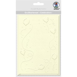 Grußkarten-Set "Celebration" besteht aus 5 creme-farbige hochdoppelte Karten aus Prägekarton 220 g/m² in dem Format 115 x 170. Dazu erhalten Sie 5 creme-farbige Kuverts in der Stärke 120 g/m².