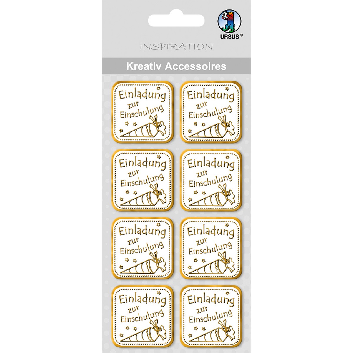Kreativ Accessoires als qudratisches Emblem mit runden Ecken und einem goldenen Schriftzug "Einladung zur Einschulung" in glänzender Folienveredelung mit edlem Perleffekt. Die selbstklebenden Sticker sind für das Gestalten eigener Einladungskarten zur Kommunion besonders zu empfehlen.