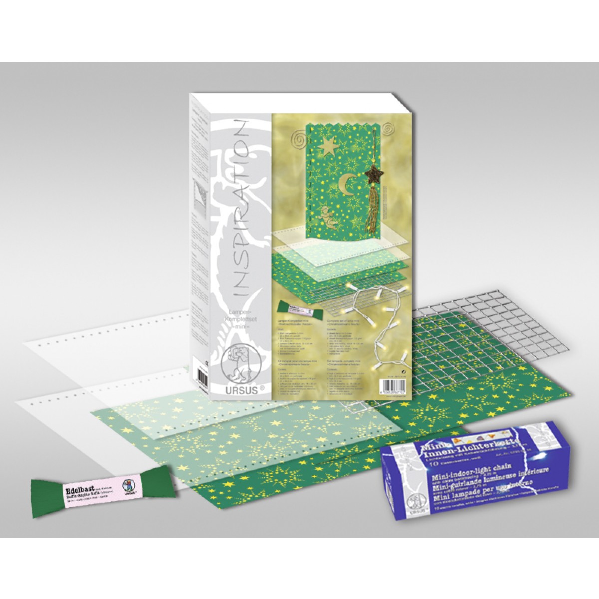 Das Lampen-Komplettset mini "Sternenglanz" besteht aus 2 Blatt Lampenfolie "mini" 23 x 30,5 cm, 2 Blatt Transparentpapier 23 x 30,5 cm, 1 Lampen-Gitterdraht 18 x 26 cm, 1 Mini-Innen-Lichterkette "weiß" (Lichtstrang mit 10 Elekrokerzen), 1 Bündel Edelbast matt "dunkelgrün" und eine Bastelanleitung. Ideal zum Basteln von originellen Lampen.