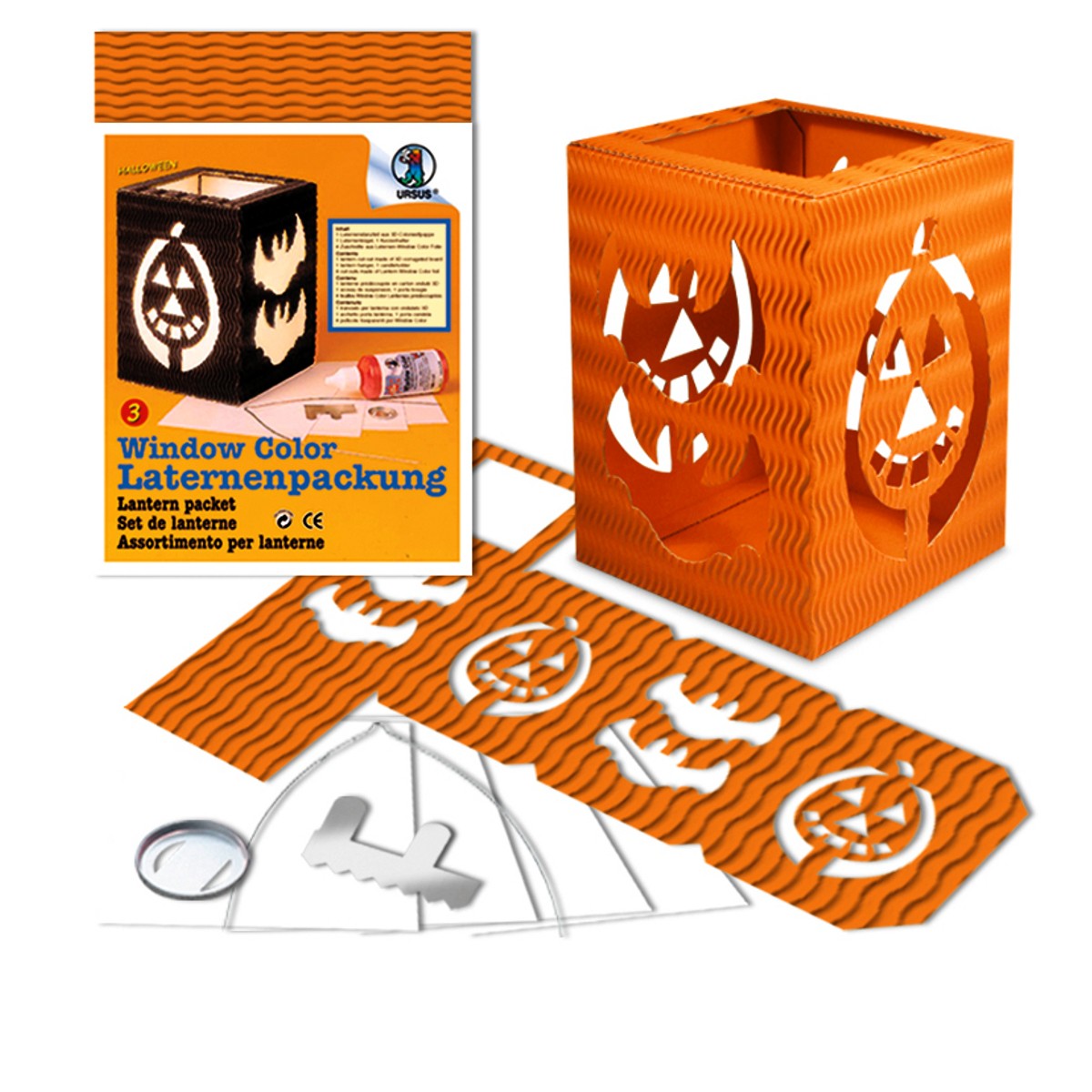 Die Laternen-Packung "Form 3" für Halloween beinhaltet das komplette Bastelmaterial für eine Laterne mit Kürbissen und Vampiren in den typischen Halloween-Farben Orange und Schwarz. Das Laternen-Stanzteil aus 3D-Colorwellpappe von URSUS® in der Stärke von 260 g/m² hat eine Breite und Tiefe von 13,5 cm sowie eine Höhe von 18 cm. In das vorgestanzte Laternen-Gerüst werden die 4 Zuschnitte aus Laternen-Kreativ-Folie eingeklebt und der Kerzenhalter plaziert. Fertig ist Ihre selbst gebastelte Laterne als Teil einer geschmacklosen Tischgestaltung für die Halloween-Party.