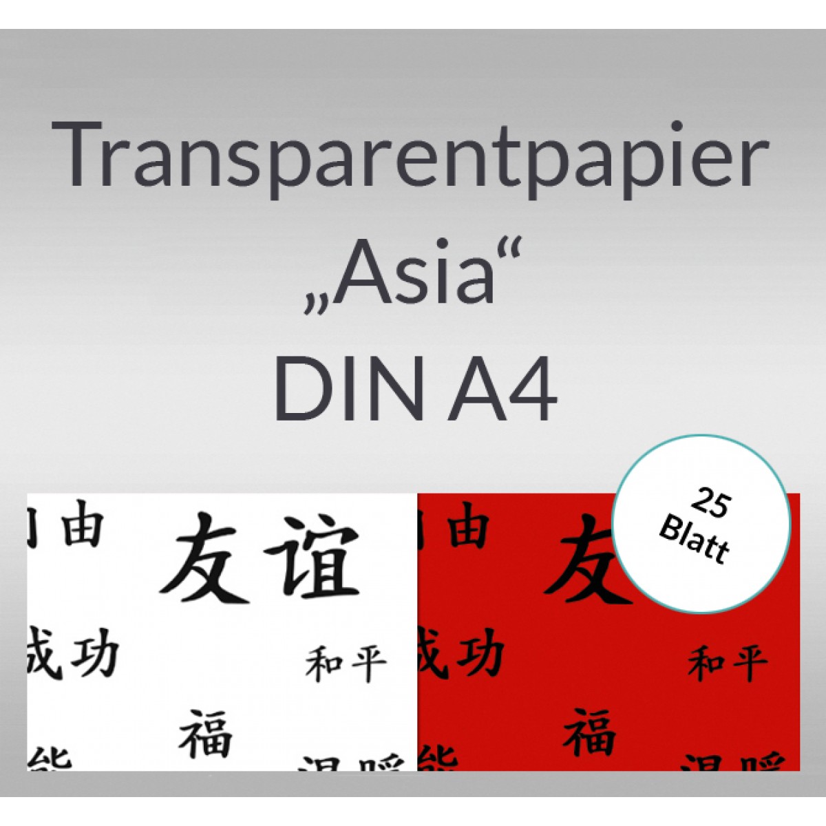 Fernöstliches Design verleiht dem Transparentpapier „Asia“ sein besonderes Gesicht. Entdecken Sie das hochwertige Bastelpapier von URSUS® und verleihen Sie Karten, Windlichtern und Co. mit dem 115 g/qm starken Papier eine einzigartige Optik. Das einseitig mit chinesischen Schriftzeichen bedruckte Papier ist nicht nur in 2 Farben, sondern auch in unterschiedlichen Formaten erhältlich. Erwerben Sie das Transparentpapier im DIN A4 Format zu 25 Blatt.