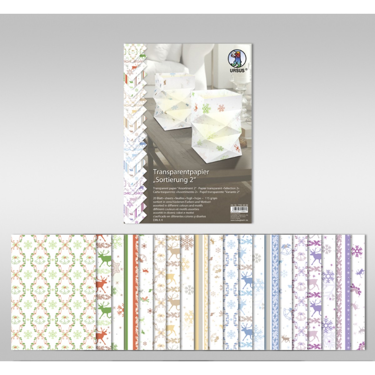 Die Packung Transparentpapier "Sortierung 2" besteht aus 20 Blatt, in dem Format DIN A4. Die 20 Blatt sind in verschiedene Motive und Farben sortiert und haben eine Stärke von 115 g/m².
