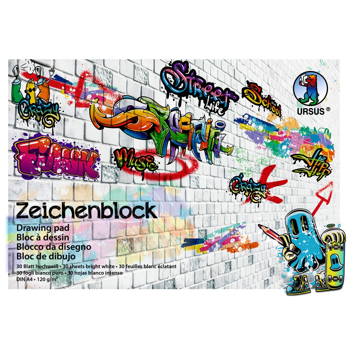 Der URSUS® Schulzeichenblock "Street Art" im Format DIN A3, ist mit seinem 120 g/m² ein extra starkes Zeichenpapier mit viel Platz für kreative Arbeiten. Auf seiner chlorfrei gebleichten, hochweißen und holzfreien Oberfläche kommen die Farben leuchtend und klar zur Geltung. Die wisch- und radierfeste Eigenschaft des Zeichenpapiers lässt verschiedene Techniken und Korrekturen zu. Hier trifft modernes Design auf ein klassisches Produkt, welches für das Malen mit Bunt- und Filzstiften ebenso geeignet ist wie für den professionellen Kunstunterricht mit Kreiden, Pastell, Kohle oder Rötel.