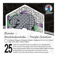 Die URSUS® Zeichenkacheln "Tangle Creation" sind 25 sechseckige Kacheln aus schwarzem Zeichenkarton in der Größe von 9 x 9 cm mit abgerundeten Ecken in einer Box. Der Zeichenkarton hat eine Papierstärke von 290 g/m² und die Aufbewahrungsbox in der Größe 10 x 10 x 2,3 cm ist aus besonders starkem Karton mit 650 g/m² passgenau enthalten. Alle URSUS® Zeichenkartons sind aus holzfreiem Papier hergestellt, die chlorfrei gebleicht sind.